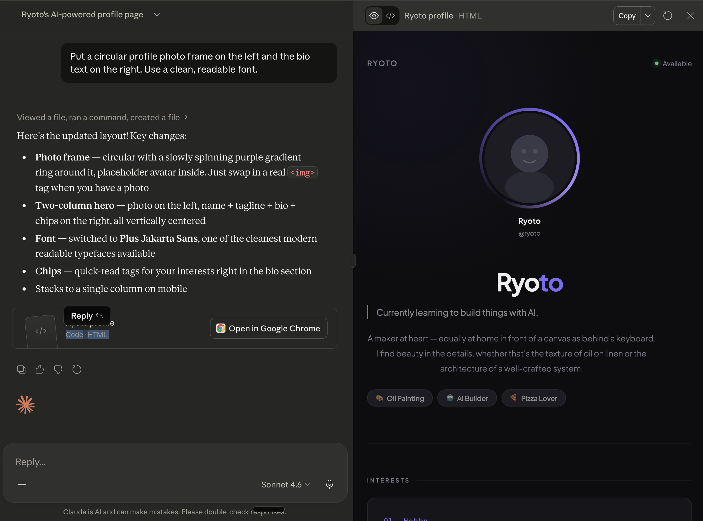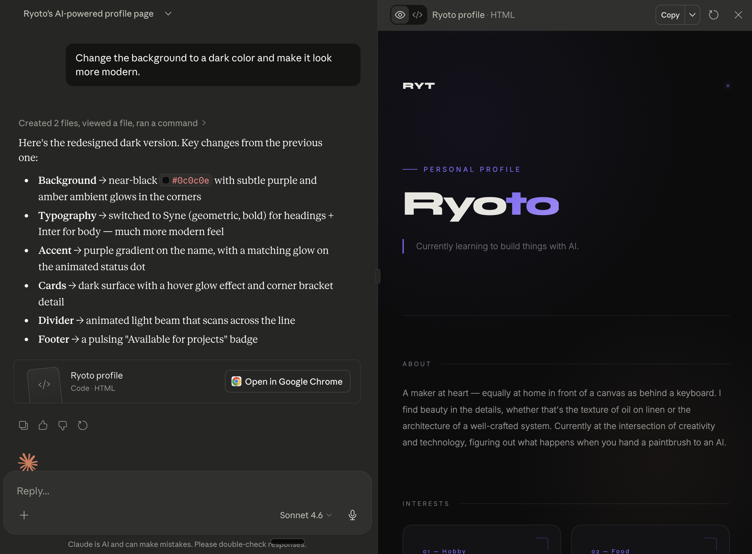 Hit send, and Claude will write the code. A web page should appear on the right side of the chat.
