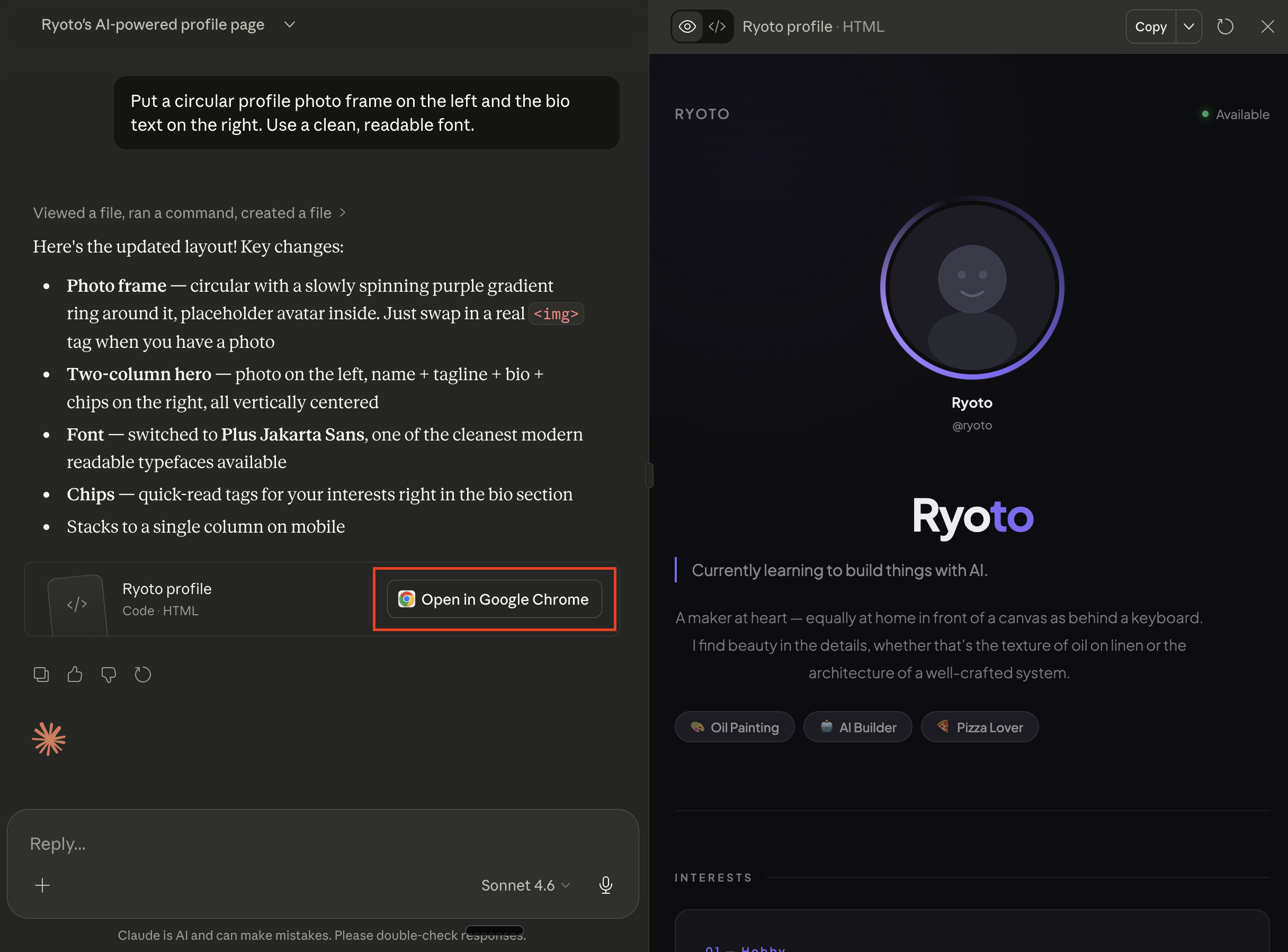 Once you're happy with your page, let's open it in a browser. Just click the "Open in Google Chrome" button shown in the red box in the image.Your page will open in a new browser tab. It's a real web page running in your browser, not just inside Claude.