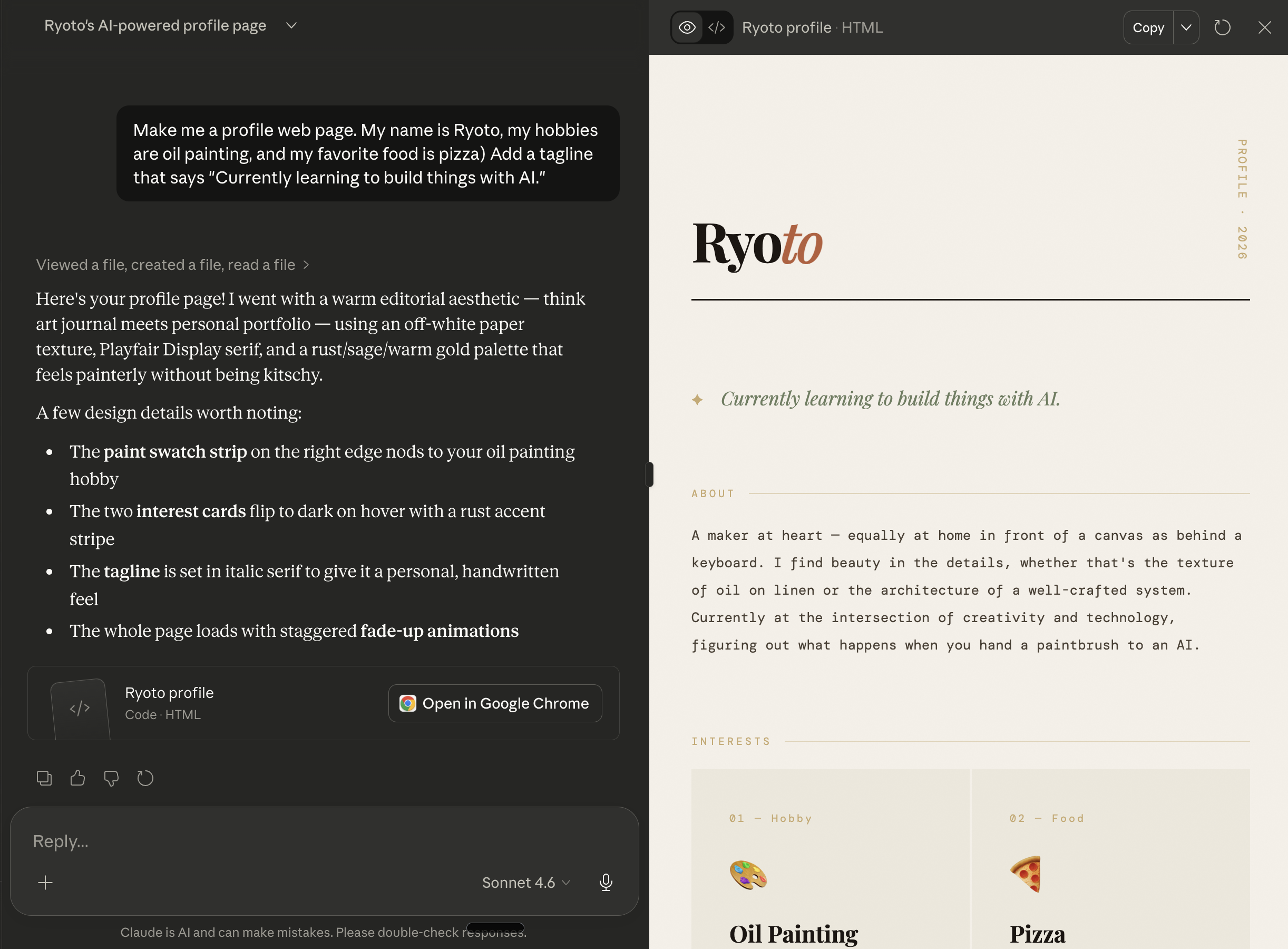 This time, we're taking that conversational power a step further. Just ask Claude to "make me a web page," and it actually will.