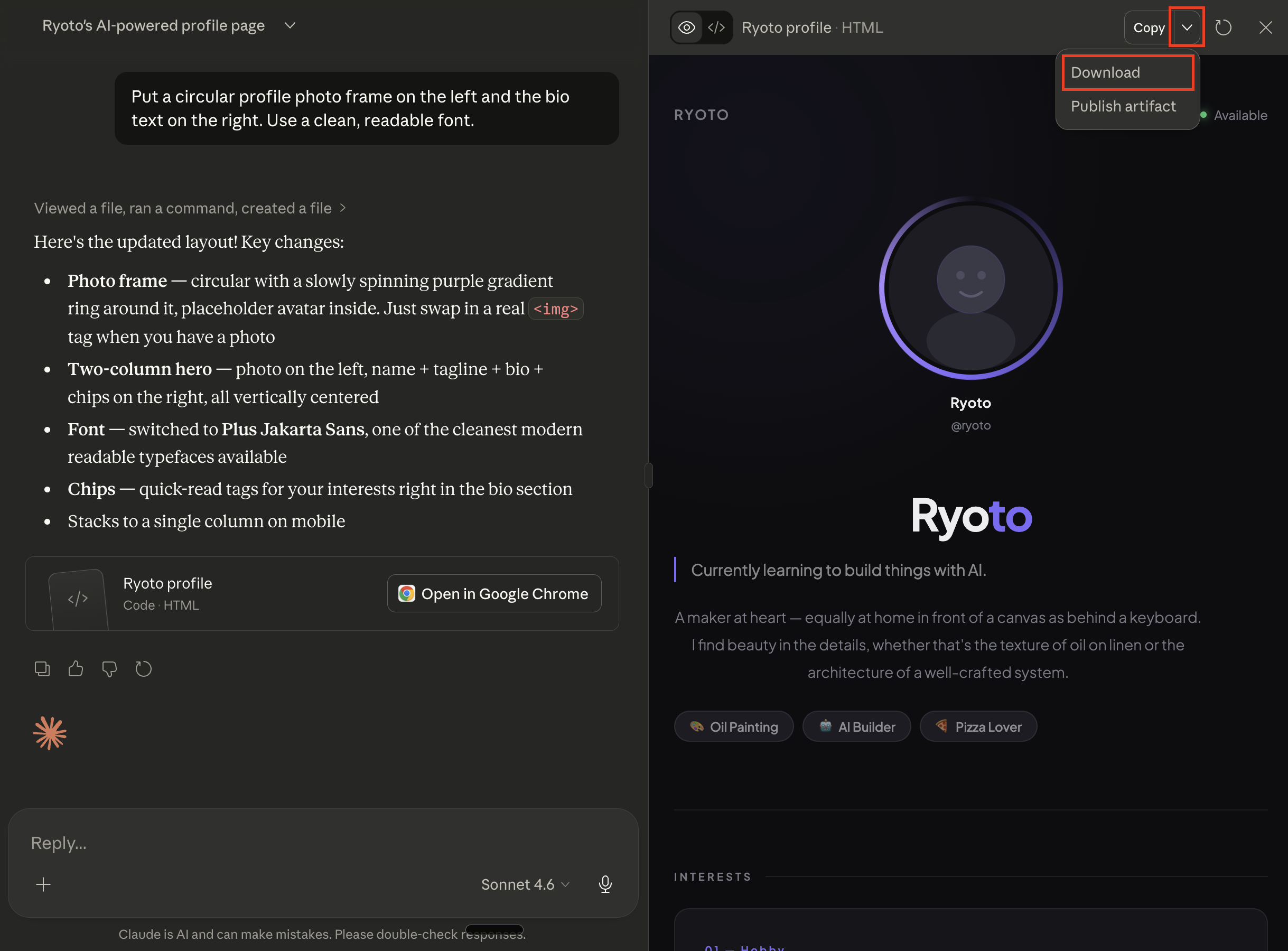 In the previous article, we built a profile page just by chatting with Claude. Seeing it pop up in the browser was pretty satisfying, right?