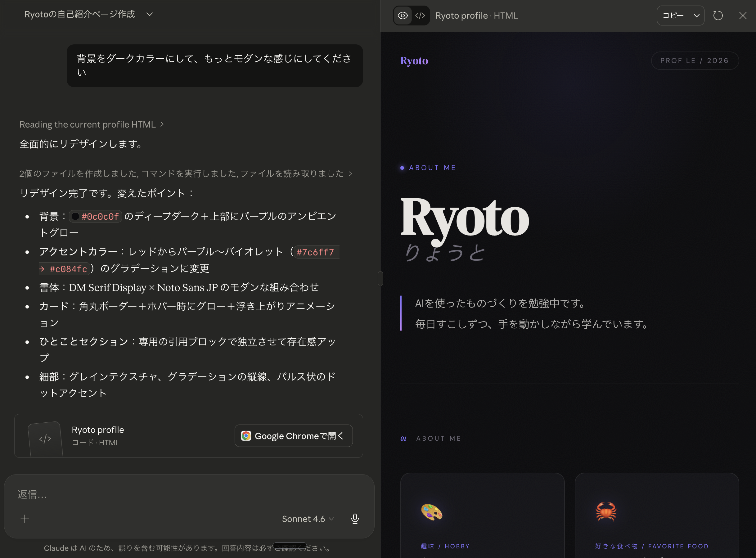 自己紹介ページのベースができたら、いろいろ追加してみましょう。全部チャットで頼むだけです。
