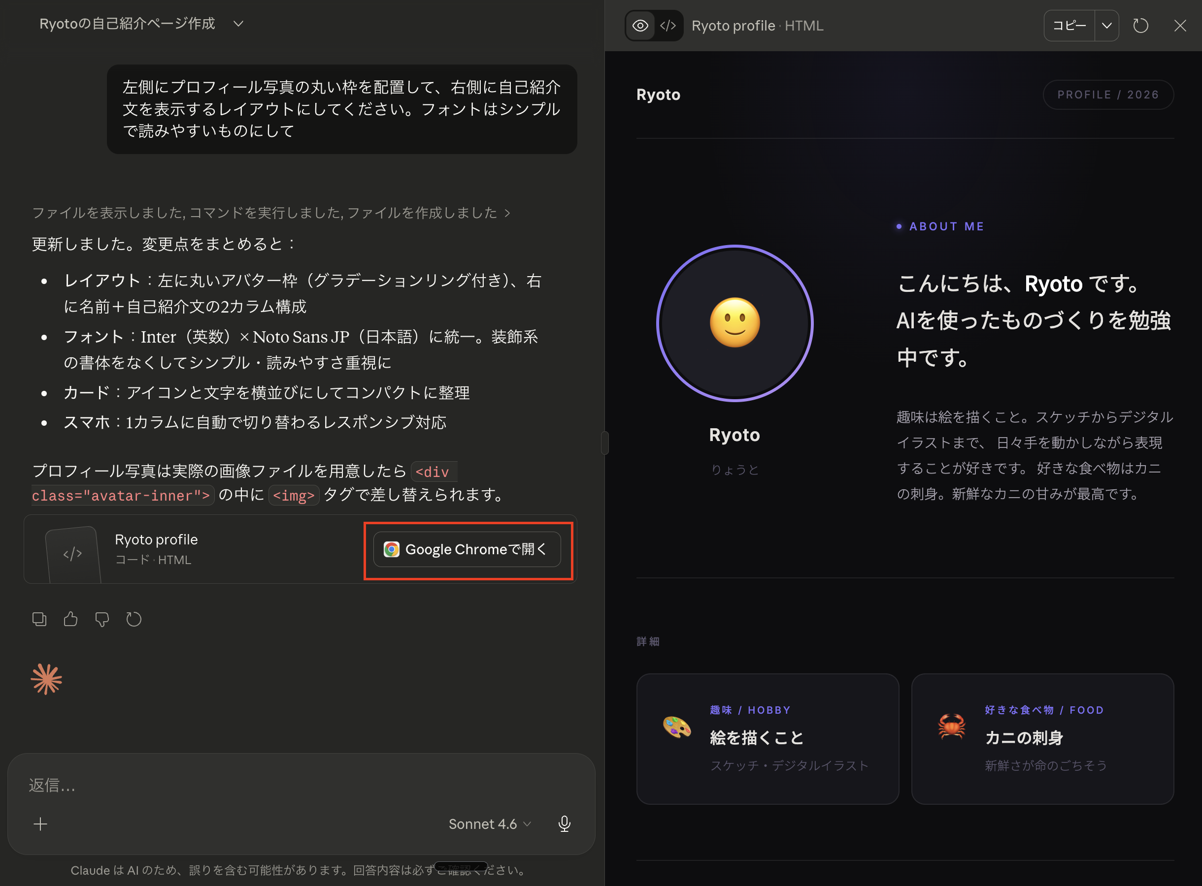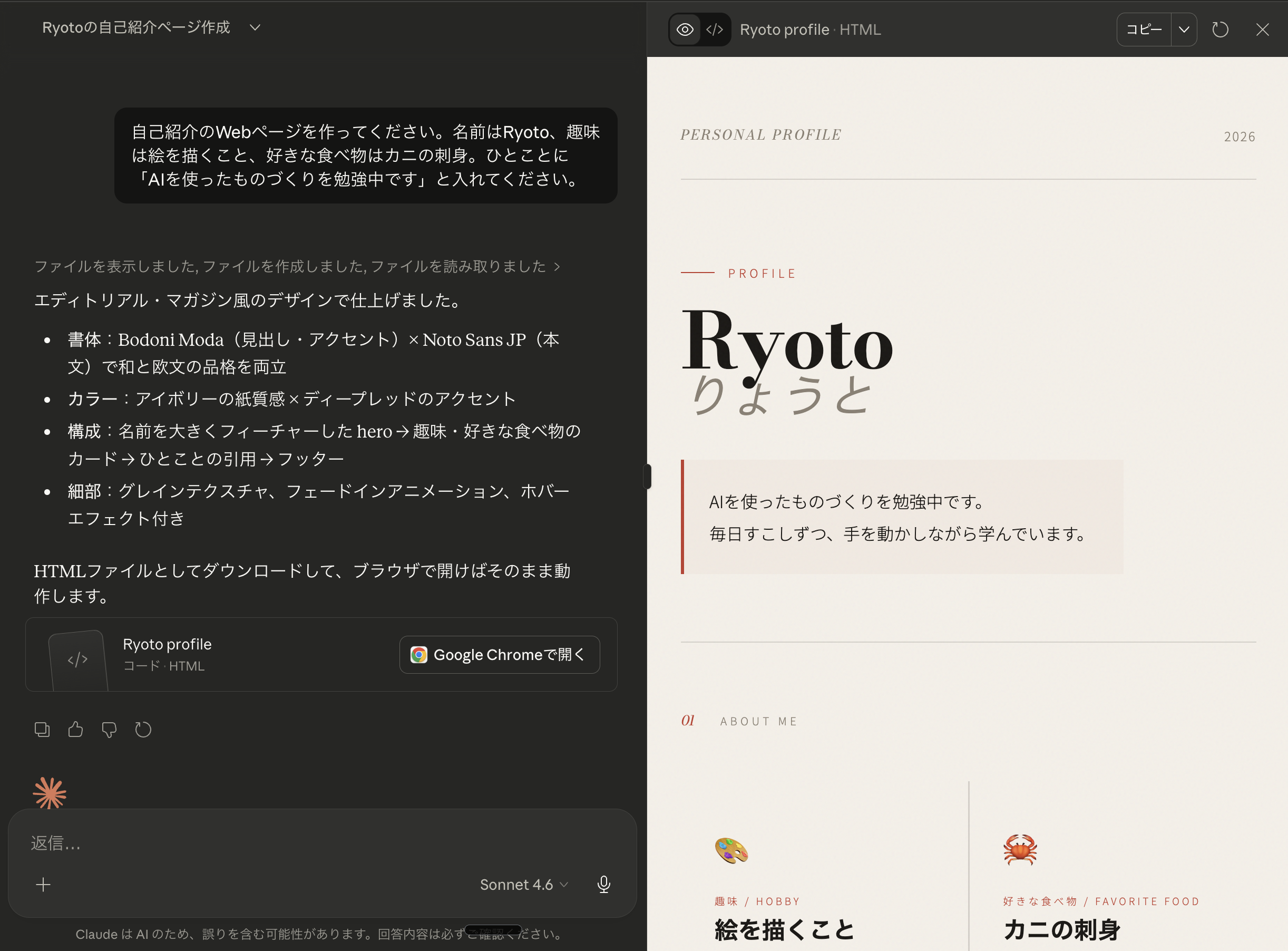 では実際にやってみましょう。今回作るのは自己紹介ページです。自分のことを紹介するシンプルなWebページを、Claudeに作ってもらいます。