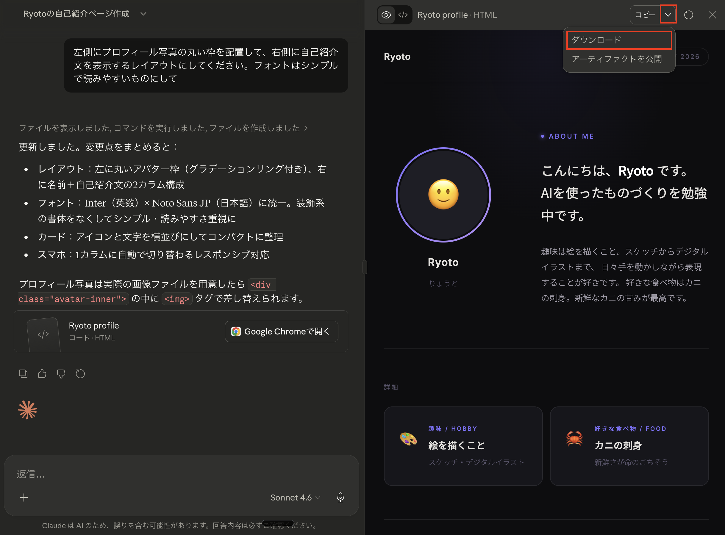 - Claudeを開いて、自己紹介ページを作った会話を見つける